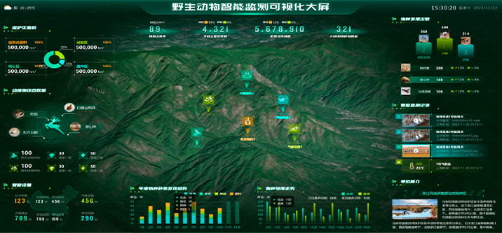 大屏可视化系统通过三维全景和实时数据融合,提供保护区内生物多样性和环境变化的直观展示,增强科研和管理工作的效率,同时为用户带来科技与自然融合的视觉体验。